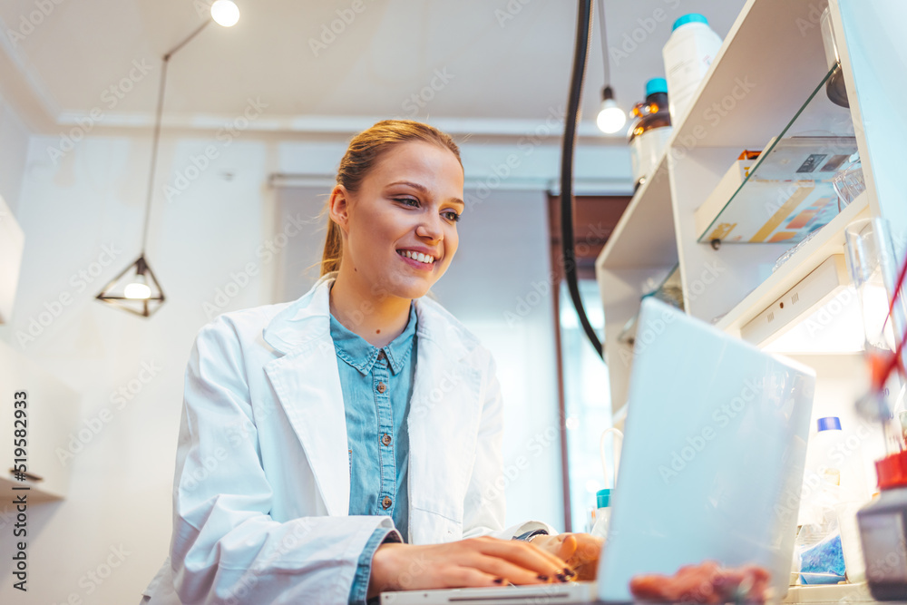 Shot of a female scientist working in a lab. Close-up of serious laboratory worker holding ampoule in front of eyes and examines contents. Scientist in protection gloves eyewear and white coat.