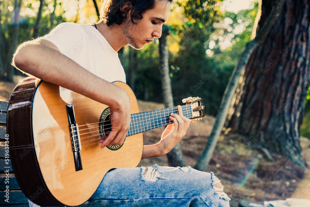 Handsome guy plays the guitar on the nature sitting on a bench. Guitarist plays on guitar outdoors. Young man plays a musical instrument outside house. Musician plays a classical guitar in the park.