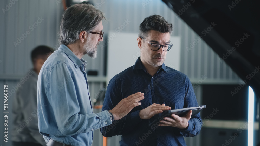 A manager in casual clothes and a male client standing near the car in a car service during diagnostics and watching data on a tablet