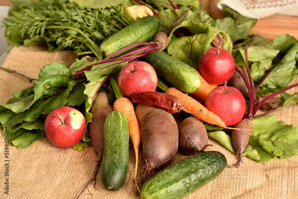 In the picture, ripe vegetables, beets, cucumbers, carrots and apples lie on the table.