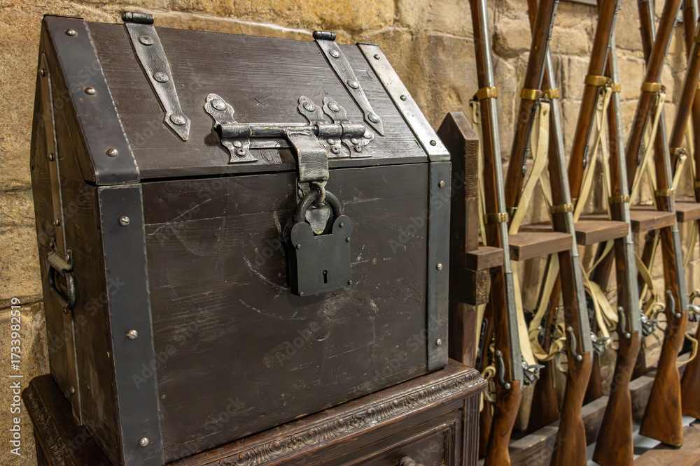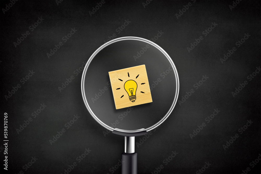 Creative idea concept, magnifying glass and light bulb icon on wooden block with chalkboard