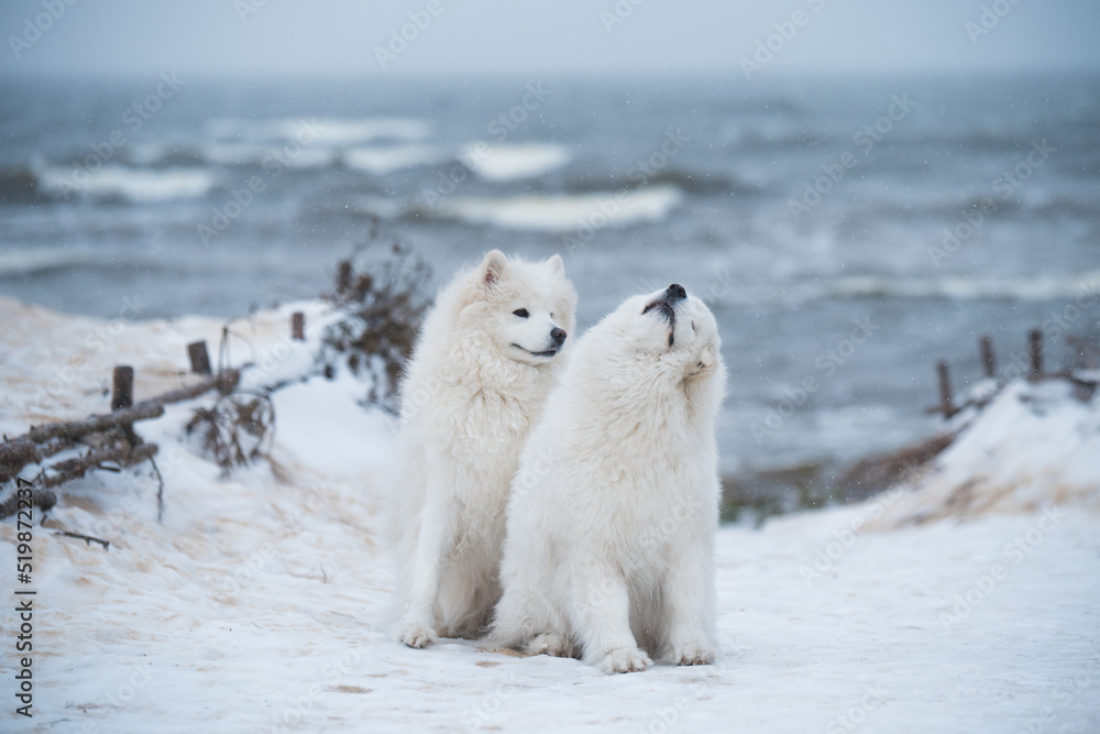 Two Samoyed white dogs are on snow sea beach in Latvia
