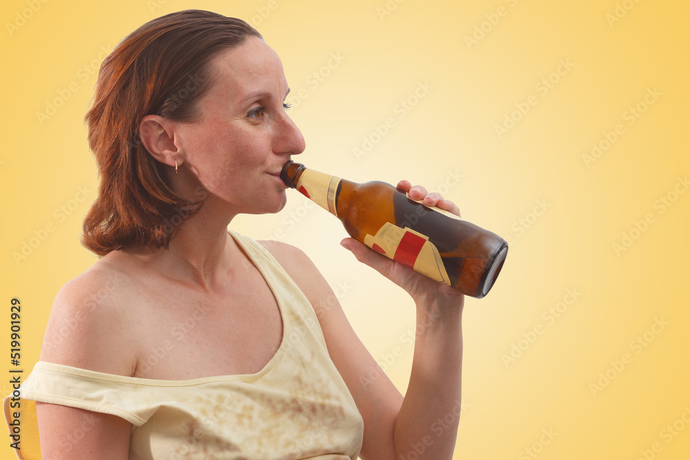 Young woman in rumpled clothes drinking beer from a bottle. Female alcoholism