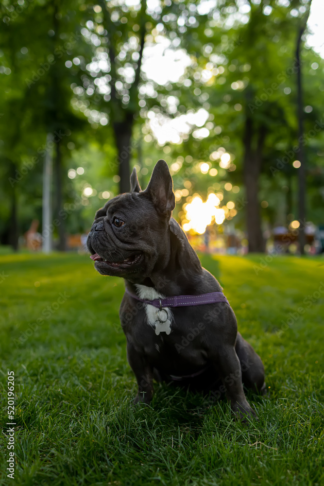 beautiful black french bulldog being trained in the park at sunset looks away with his tongue hanging out