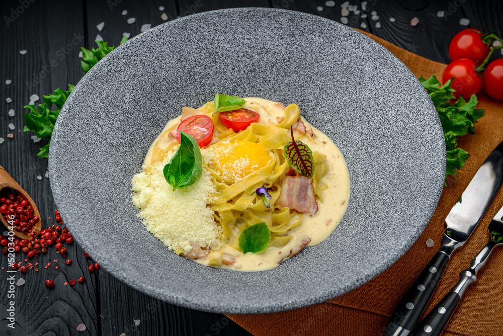 Pasta carbonara with tagliatelle spaghetti, egg yolk, bacon and basil.