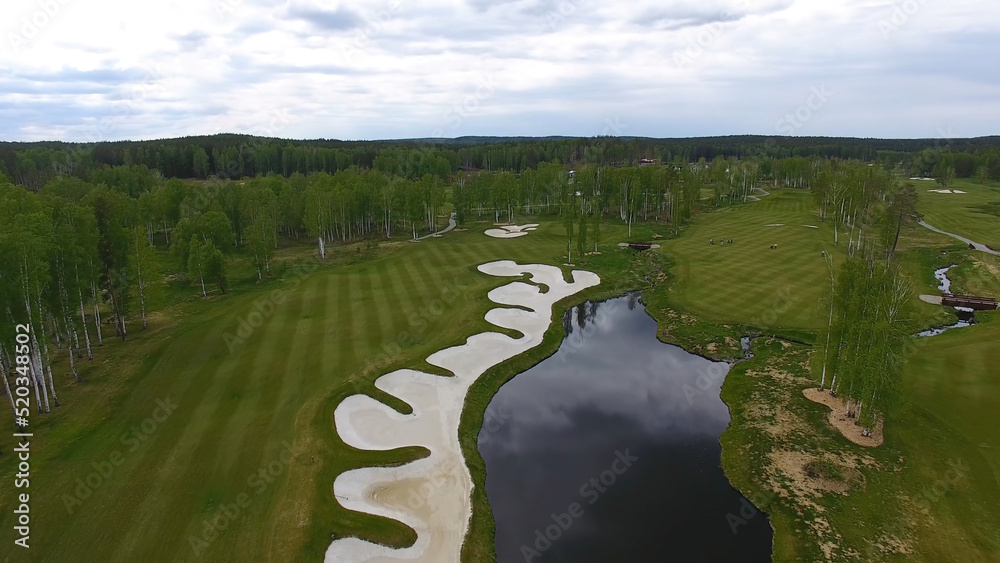 Aerial view Golf course, ponds and green lawns of the Golf course. Sand bunkers at the beautiful golf course