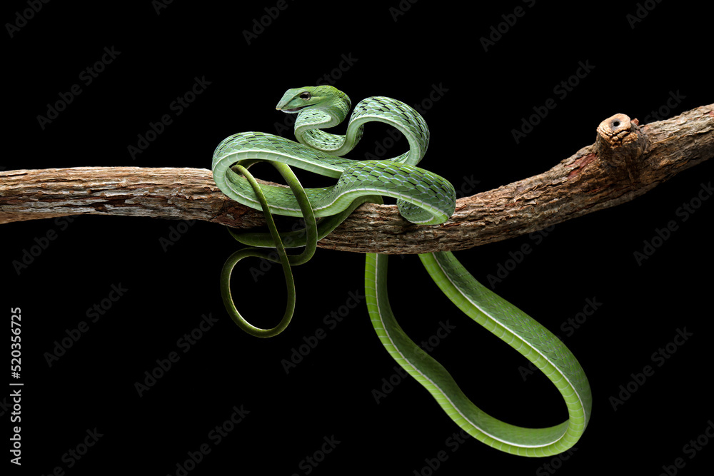 Asian Vine Snake (Ahaetulla prasina) is a species of snake native to Southern Asia. Asian Vine snake isolated on black background.