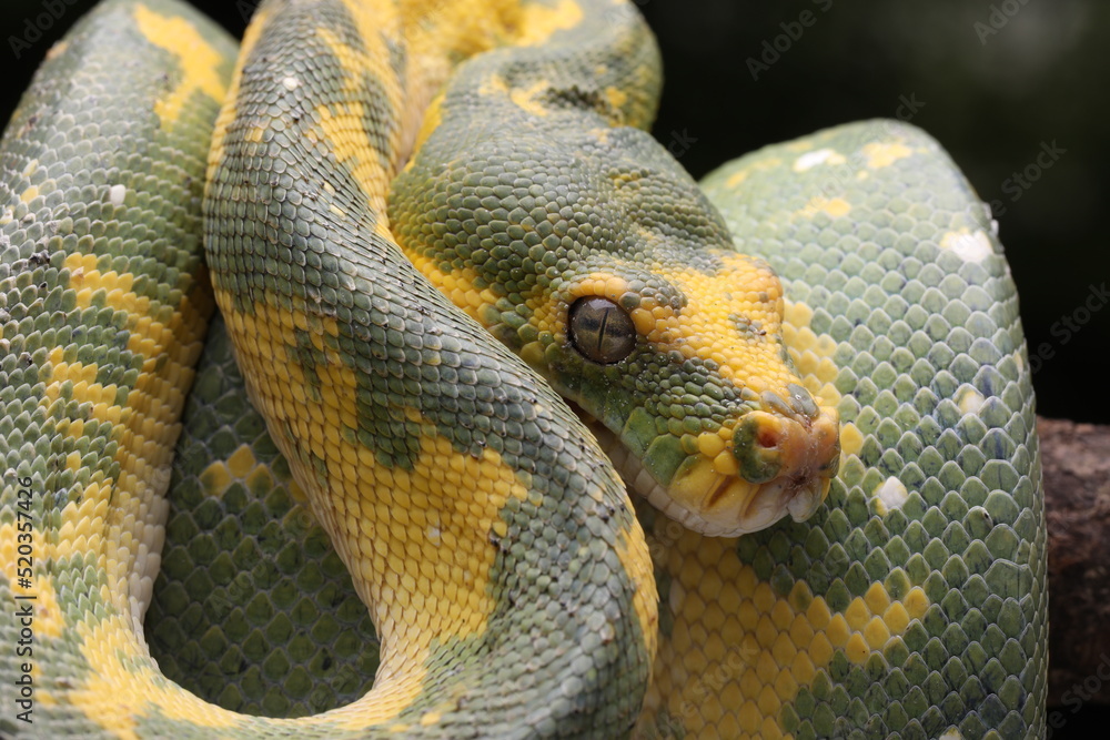 Closeup beautiful Green Tree Python (Morelia viridis). This Python is a rare species.