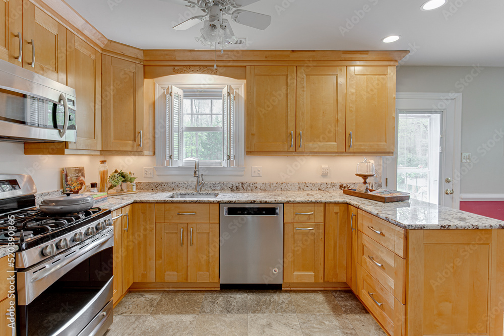 classic traditional modern kitchen interior wooden cabinets black and white marble granite counter tops stainless steel stove sink microwave white ceiling fan light fixture plants fruits in a bowl
