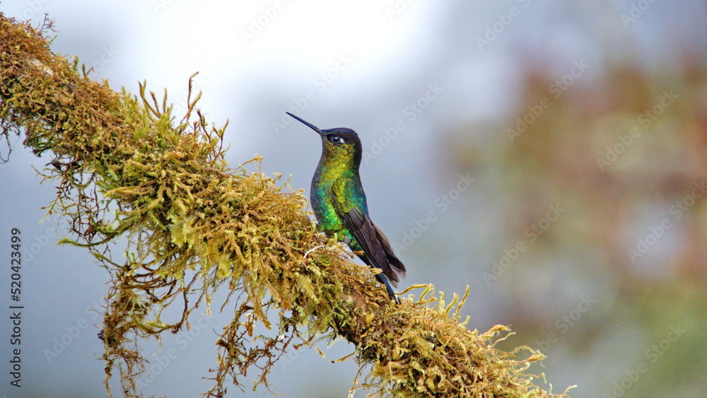 Fiery-throated hummingbird (Panterpe insignis) perched on a moss covered branch at the high altitude Paraiso Quetzal Lodge outside of San Jose, Costa Rica