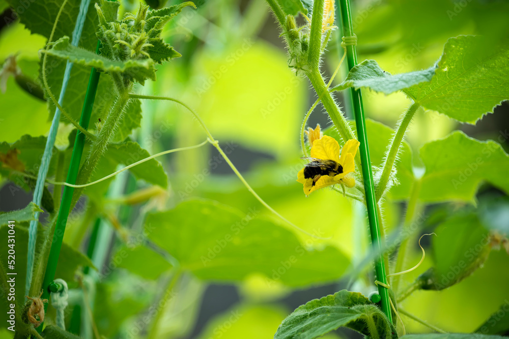 A bee pollinates a cucumber flower. Cultivation of cucumbers. home garden vegetable garden