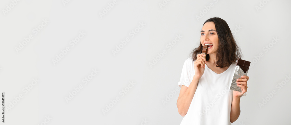 Beautiful young woman eating tasty chocolate on light background with space for text
