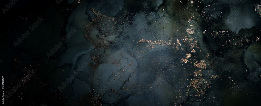 art photography of abstract fluid art painting with alcohol ink, black and gold colors
