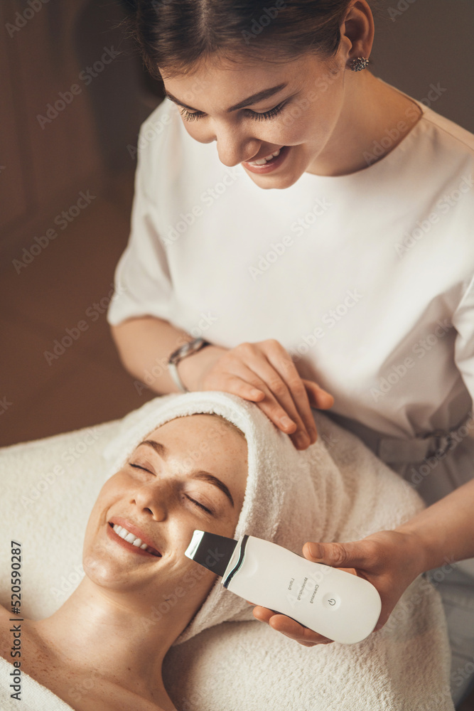 Smiling caucasian woman receiving ultrasound cavitation facial peeling at spa salon. Cosmetology and facial skin care. Hardware professional cosmetology.
