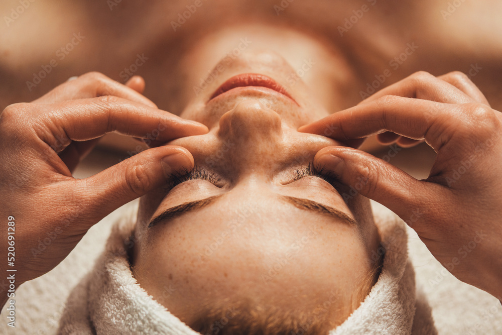 Beautician massaging face of caucasian woman in spa salon. Young woman enjoying massage at spa salon. Beautician rubbing temples of client.