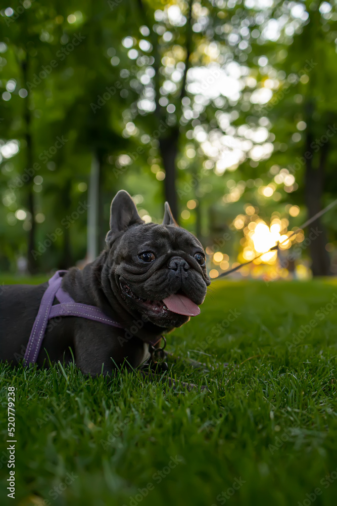 funny black french bulldog dog breed lay down in the park on the lawn with his tongue hanging out and big eyes