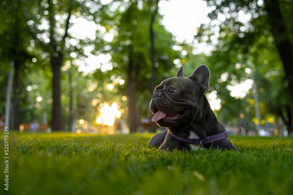 training a thoroughbred French bulldog, who is now lying in the park under sunset