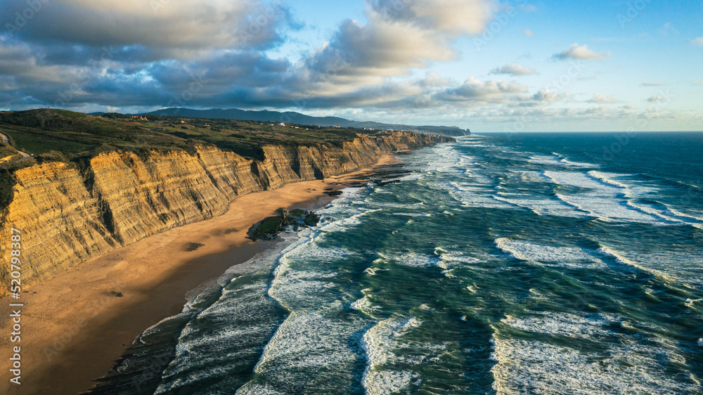 Drone aerial view over long rocky coastline in Magoito with clouds sky over ocean in summer day. Beautiful natural landscape with ocean rocky shore. Drone view over Scenic European tourist destination