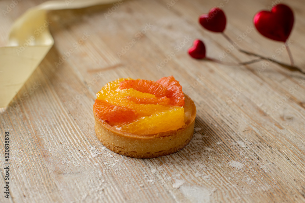 Tartlet - dessert with tangerine and grapefruit lies on the table for Valentine's Day