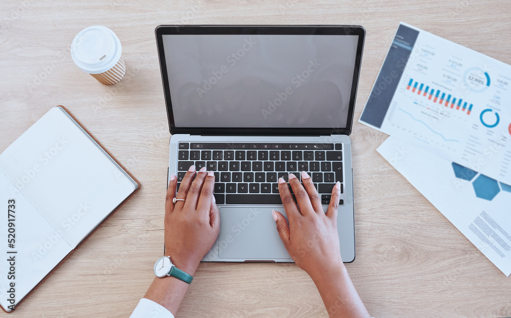 Digital marketing hands typing a report on a blank computer. Female office worker looking at finance graphs for work. Above view of a business woman working on a laptop while doing online research
