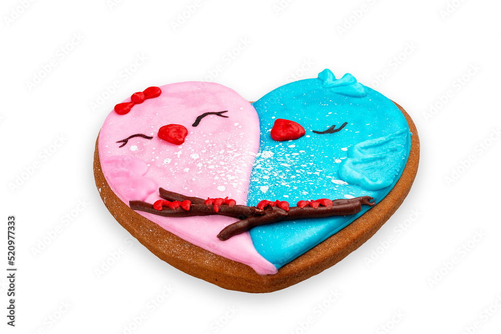 Gingerbread in the shape of a heart, with a picture of birds . Isolated on white background