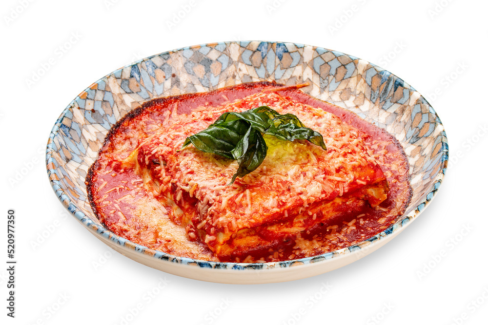 Lasagna in a decorative plate. Italian dish. On a light background.