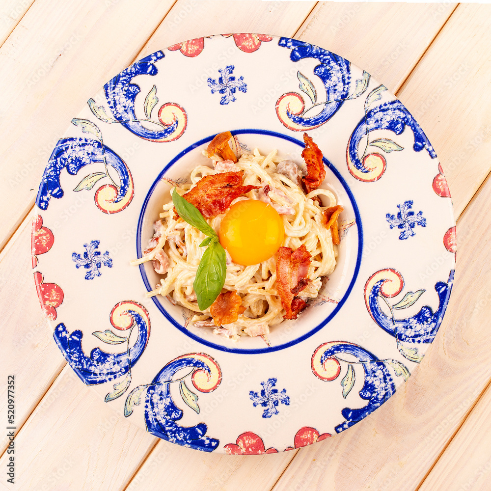 Carbonara pasta with bacon and chanterelles in a decorative plate.