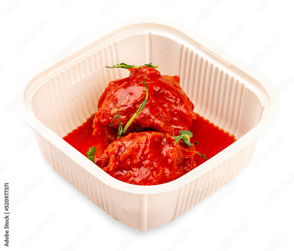 Meatballs in tomato sauce. In a plastic container. Food to go. On a light background.