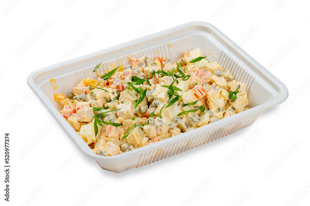Traditional Russian salad "Olivier". In a plastic container. Food to go. On a light background.