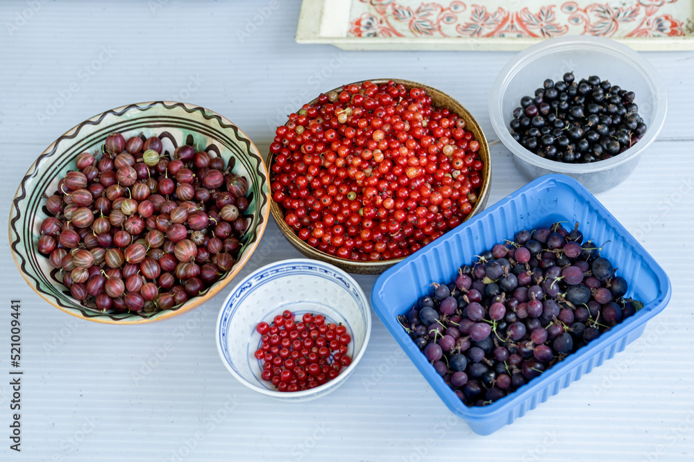 Fresh summer berries in a plate: red currants and gooseberries from the garden