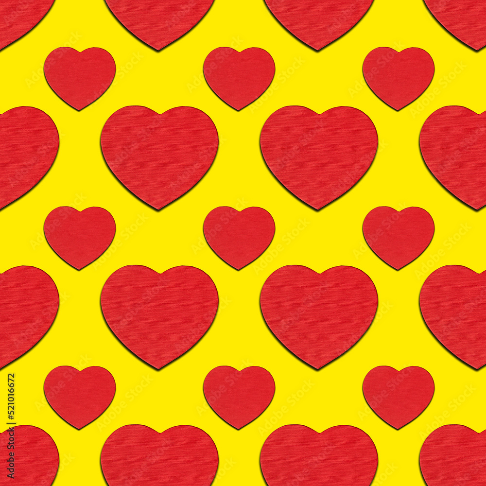 A seamless pattern of red hearts on a yellow background. Valentine's Day, Love