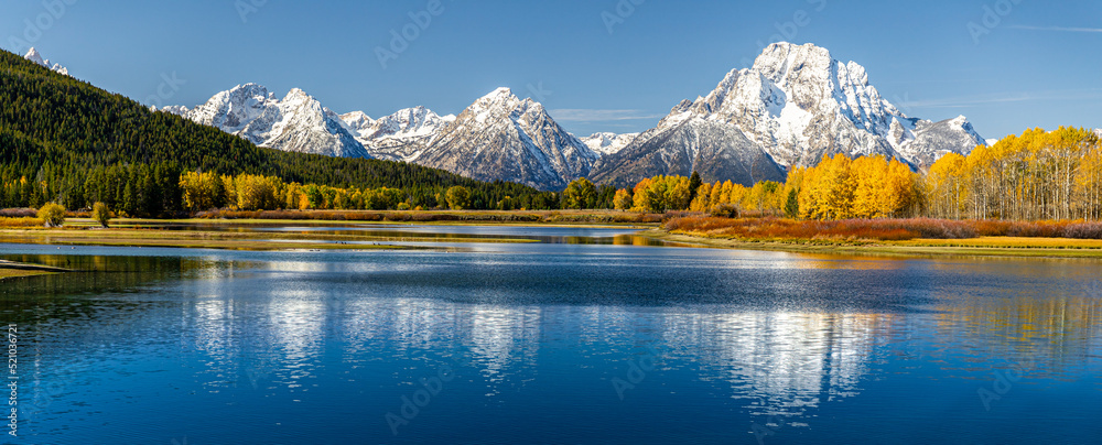 Panoramic view of Mount Moran from Oxbond bend of Grand Teton.