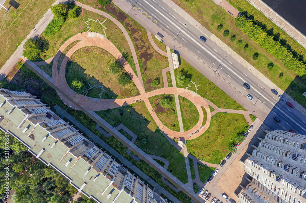 Paved eight shaped path road in the city courtyard at sunny day top aerial view