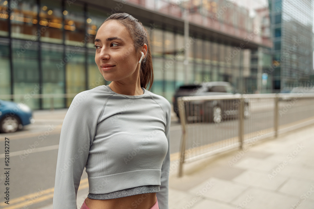Beautiful Fitness woman in sportswear have a rest after workout on city background