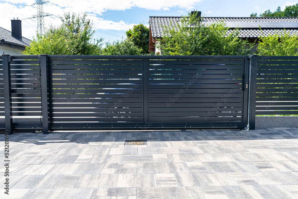 Modern panel fencing in anthracite color, visible sliding gate to the garage as well as a handle and a lock.