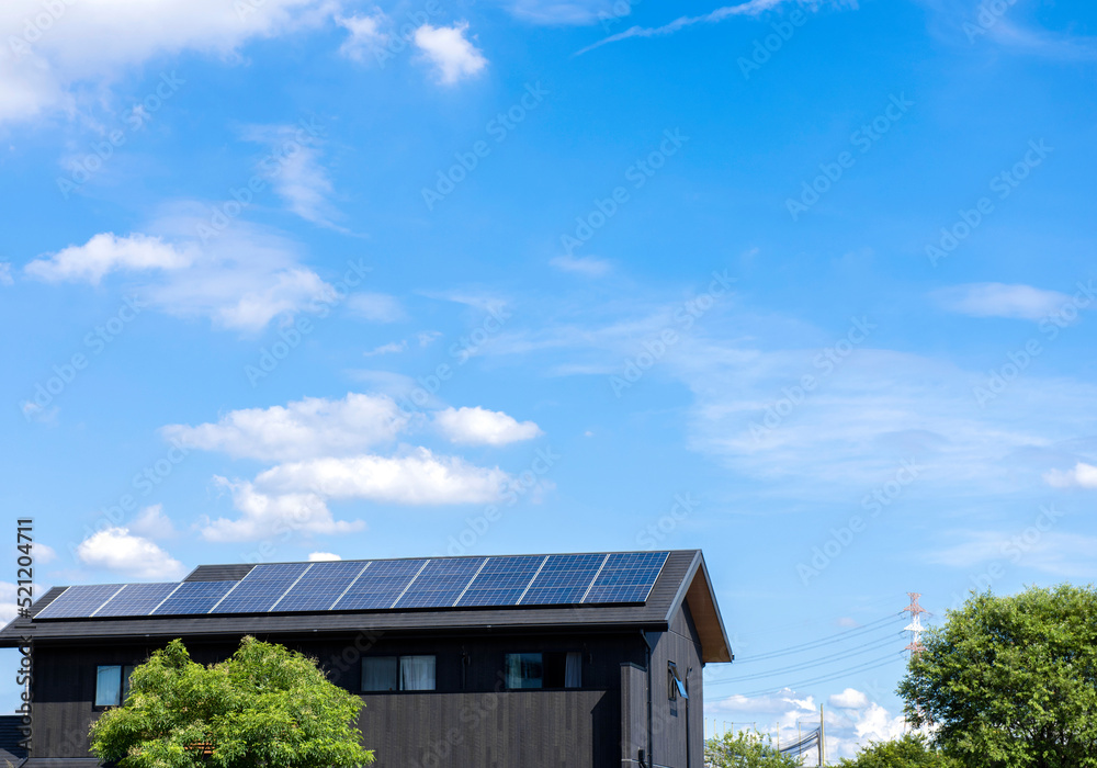 太陽光パネルが設置された住宅の屋根と快晴の青空。