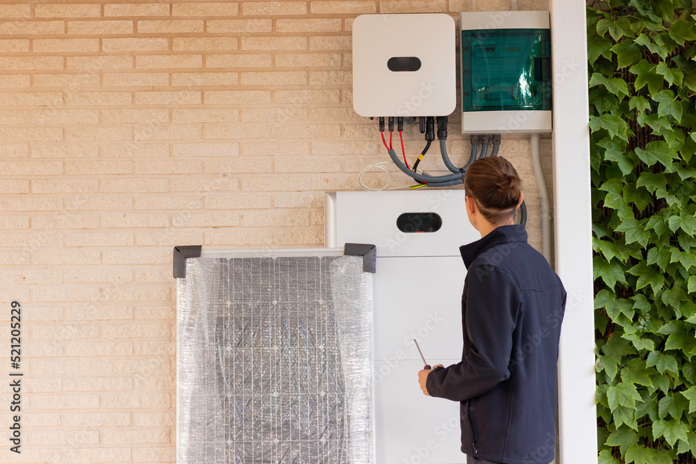 Back view of unrecognizable young man technician installing a solar system for renewable energy