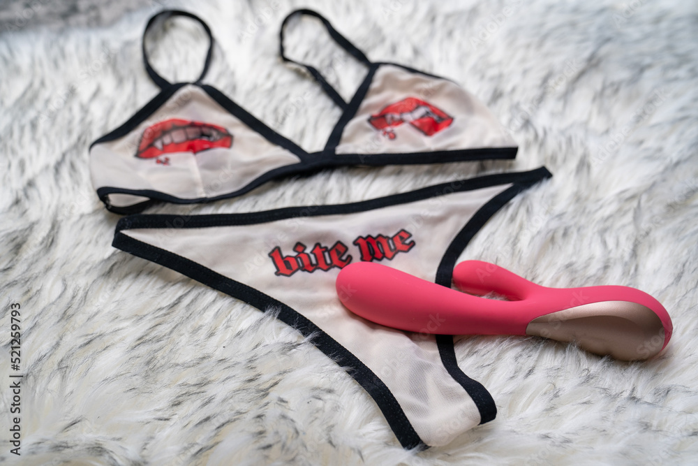 woman's sexy white underwear with lips and word "bite me" print, on the gray fur background. Pink vibrator dildo sex toy is on the panties