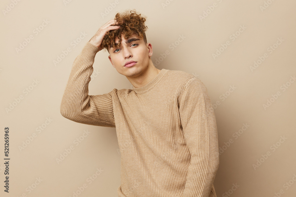 a charming, handsome man stands on a beige background in a sweatshirt and looks at the camera with a relaxed look, holding his hands on his curly hair, making a funny facial expression