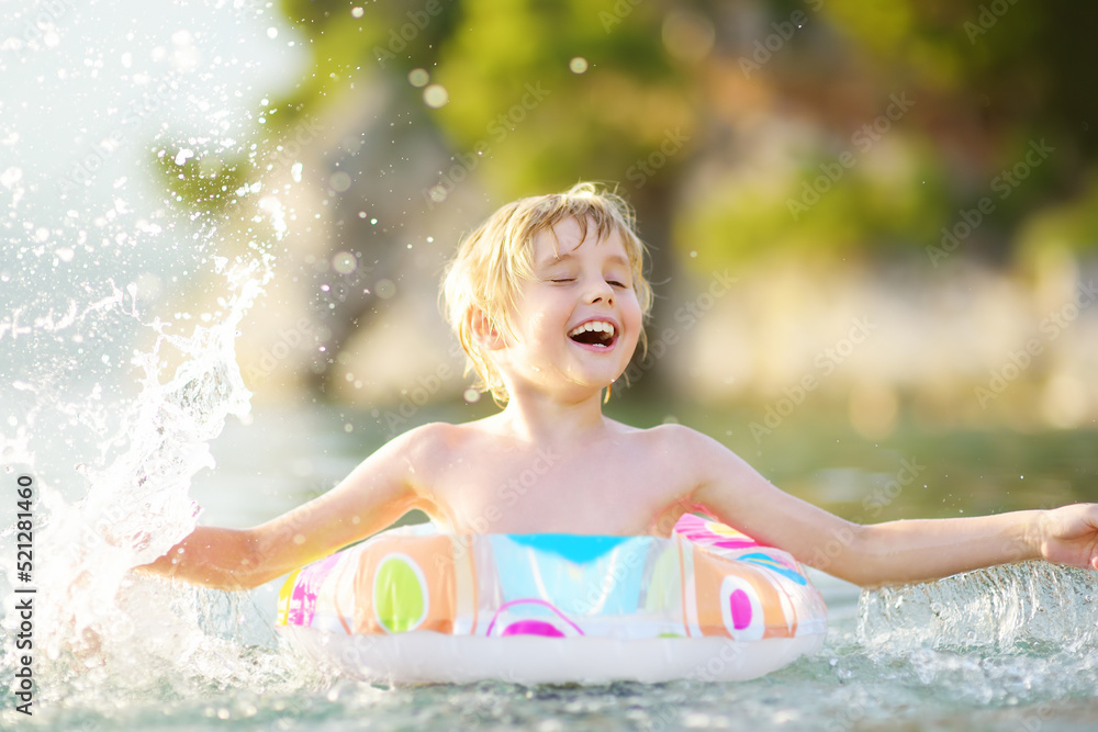 Little boy swimming with colorful floating ring in sea on sunny summer day. Cute child playing on beach. Family and children's resort holiday during summer vacations.