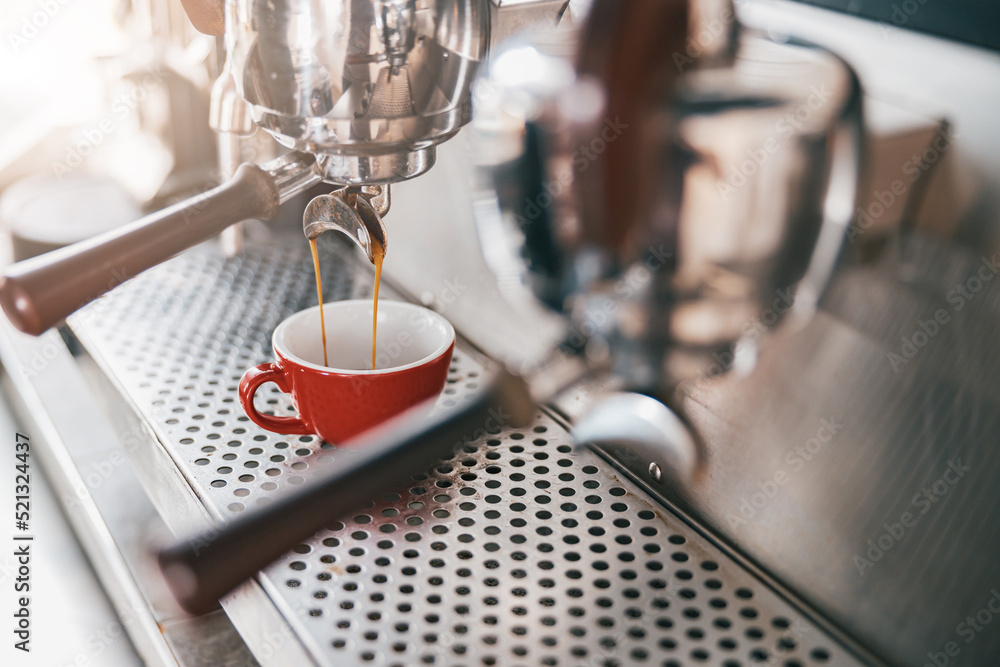 Close up view of preparing coffee espresso in automatic coffee machine in cafe