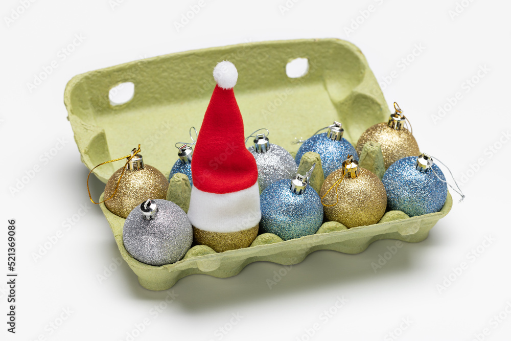 Christmas tree glitter balls in an egg carton, on one Santa's cap. Winter holidays, merry christmas.