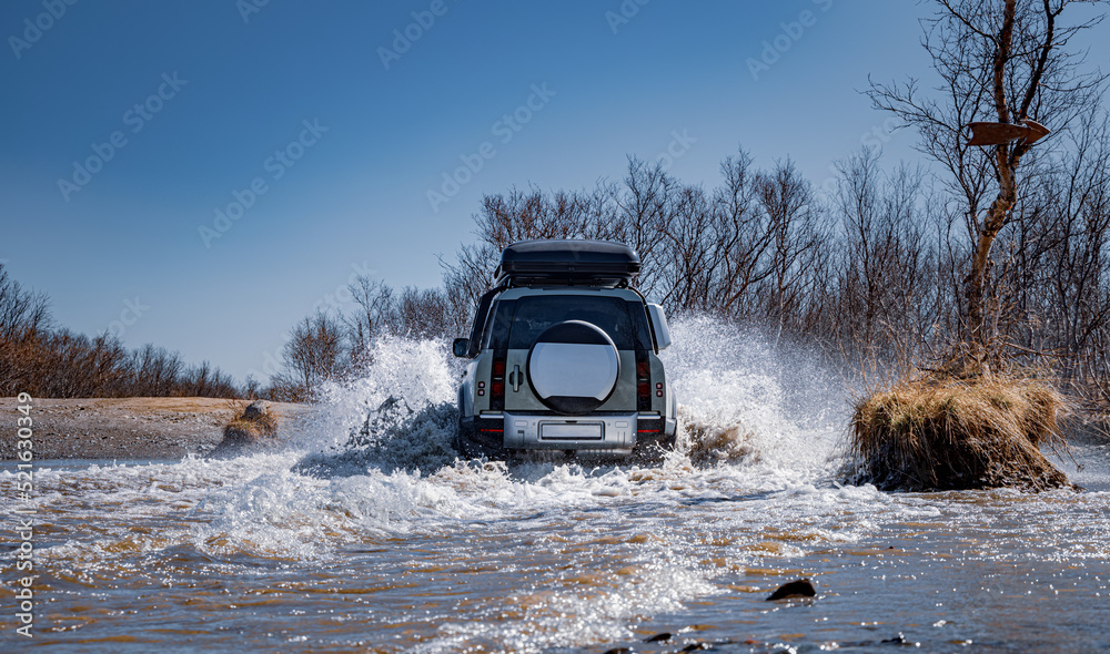 Off road tourist car rides off-road in the highlands. Expedition travel and vacation, adventures in remote areas.