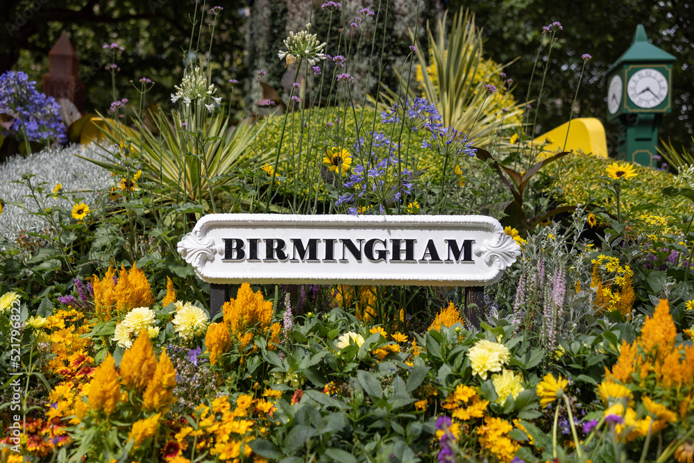 Birmingham city sign surrounded by flowers in garden of city centre park. Old black text on white background metal signage.