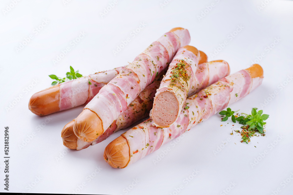 Traditionelle rohe Berner Bratwurst mit Käse und Schinken ummantelt angeboten als close-up auf weißem Hintergrund mit Textfreiraum