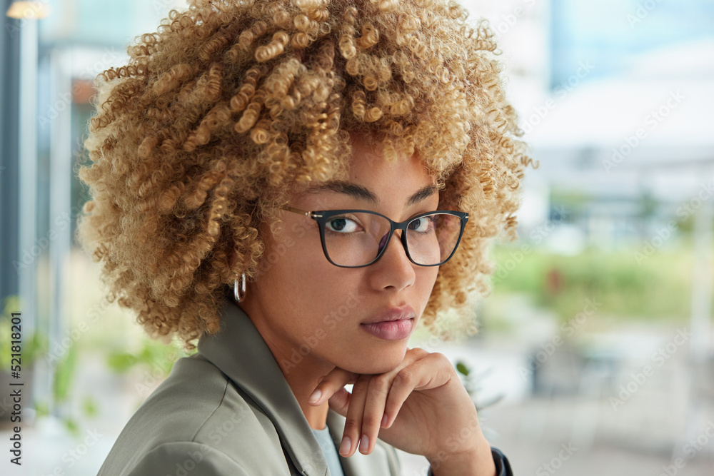 Headshot of serious successful woman with curly blonde hair keeps hand under chin wears optical spectacles and formal clothes looks attentively at camera poses outdoors against blurred background