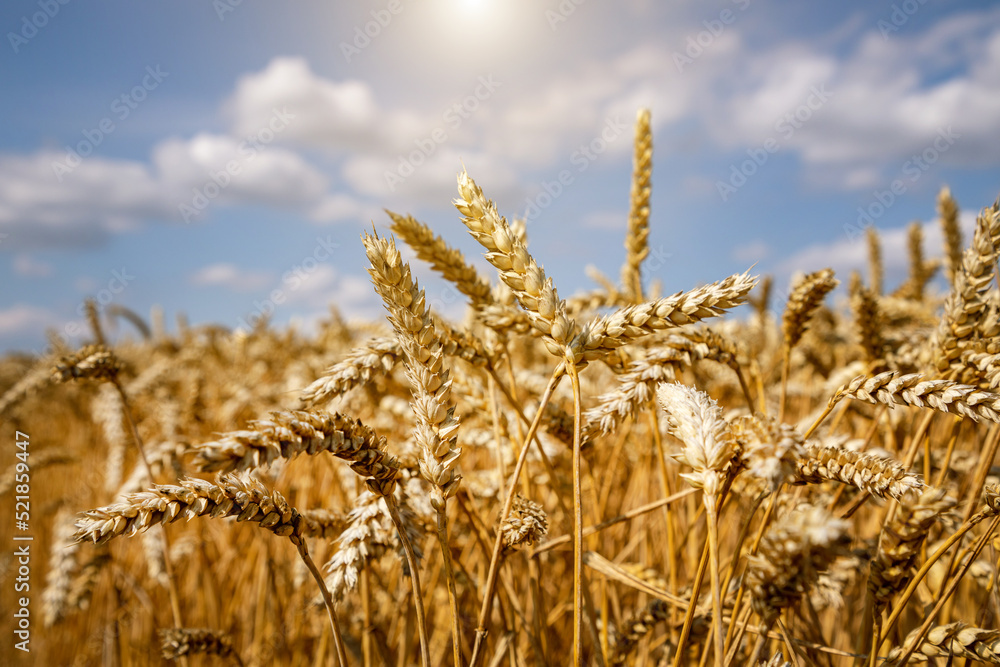 Wheat field under blue sky. Rich harvest theme. Rural landscape with ripe golden wheat. The global problem of grain in the world.