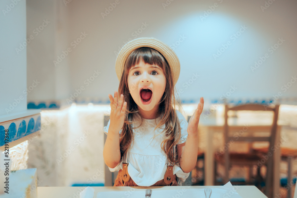 Funny Girl Screaming with Happiness in a Restaurant. Happy little child having a sense of humor and a loud voice
