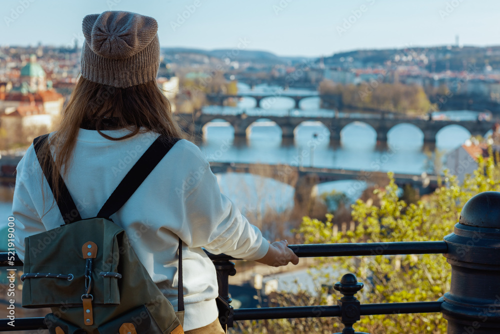 trendy woman in sweatshirt in Prague Czech Republic sightseeing
