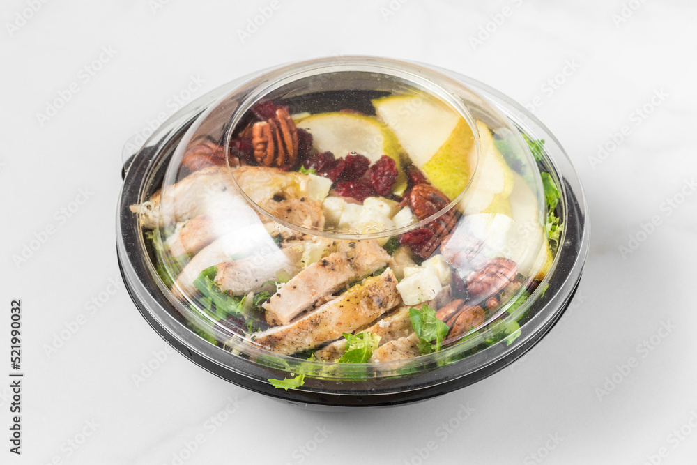 Lunch box. Plastic package with healthy chicken and pear salad for take away or food delivery on white background